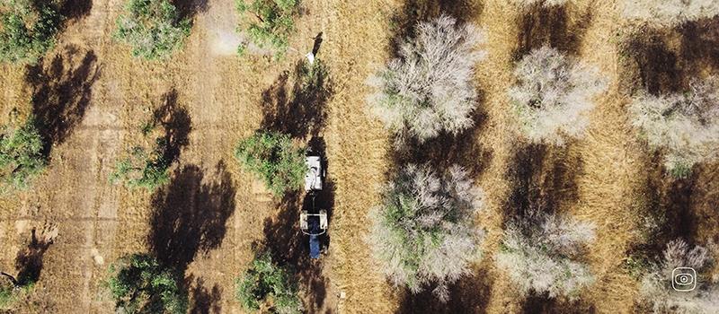 Illustration (c) Giacomo Madaro: The image has been taken with a drone and shows the contrast between the canopies of the green trees and the gray ones next to them, in Donato Minosi's land. Minosi is an olive-growing entrepreneur from southern Puglia. His company is located in the heart of the area declared infected by the Xylella bacterium. In his olive grove, he has experimented with the so-called Scortichini protocol, a biofertilizer based on zinc, copper and citric acid, to be distributed on the tree canopy, periodically, from spring to autumn, because, he says, "I didn't want to lose what I had done in 50 years". Since the beginning of the proclaimed epidemic, Donato has never stopped producing.